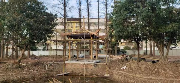 目前,該工程是建設(shè)正在如火如荼的進(jìn)行,項(xiàng)目推進(jìn)有條不紊。其重點(diǎn)工程千秋亭已經(jīng)蓋瓦完成,初現(xiàn)英姿。管理用房外墻砌筑,門窗混凝土澆筑。前院廊架屋面正在蓋瓦施工,備受矚目的西洋門墻身已經(jīng)在砌筑,線條立模,澆筑混凝土。